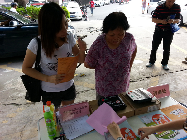 2013年9月6日,我司4名工作人员在石岐大信社区基边村开展了“爱心铃绿键现场服务”活动,向社区居民介绍爱心铃服务项目,并为没有安装的长者进行登记工作。活动期间,现场派发宣传资料47份;共有31人咨询爱心铃安装条件及緑键服务内容;其中,安装“爱心铃”登记情况为2人(有线),3人(无线)。