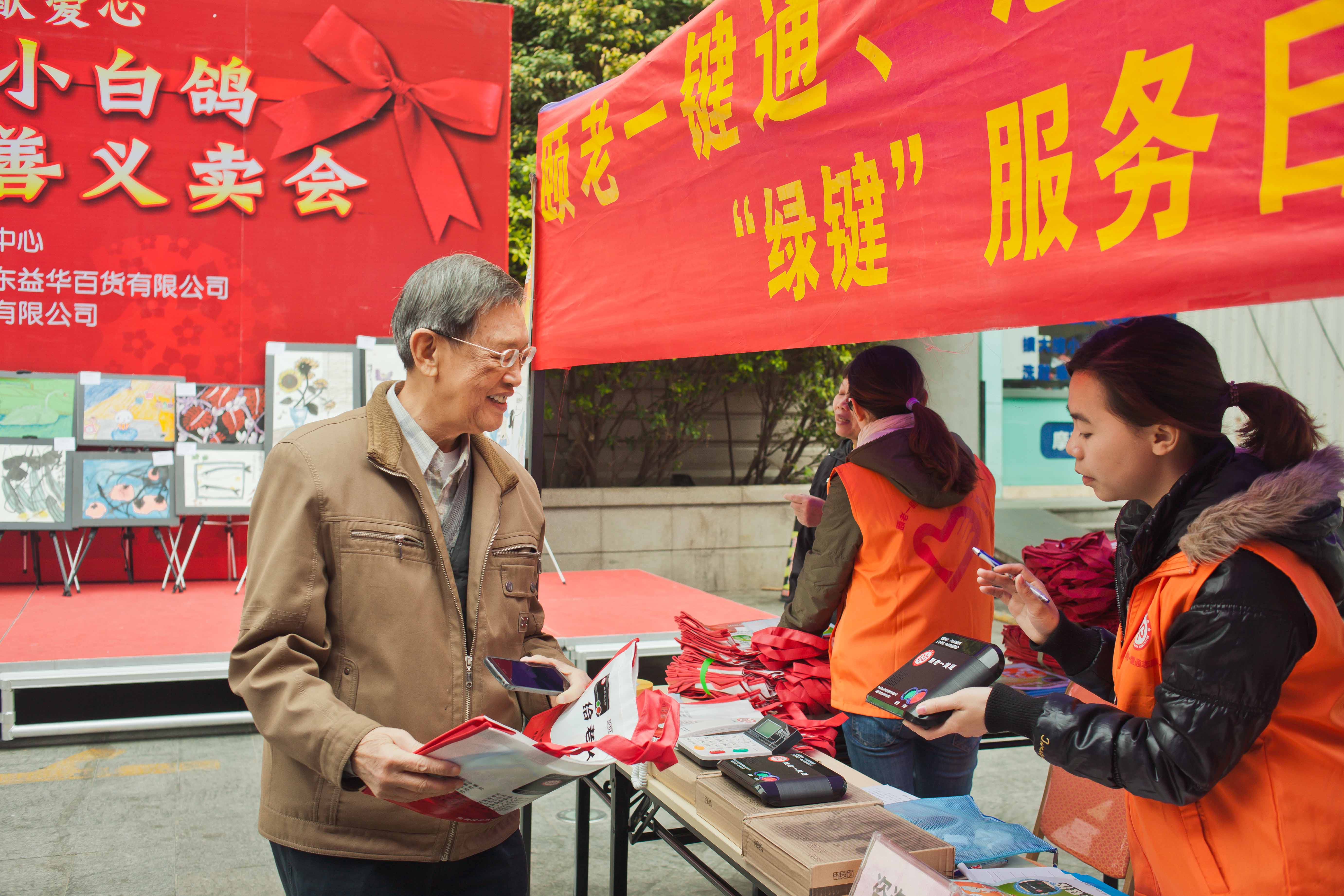 义卖会现场由“颐老一键通”义工服务队向现场群众详细介绍慈善爱心铃的使用方法及绿键服务内容,并为没有安装的长者进行登记。当日,现场派发宣传资料约150份和环保袋约150个,共约150人咨询慈善爱心铃安装条件及绿键服务内容。另外,8人接受活动问卷调查,并成功为2人登记预约安装“慈善爱心铃”有线设备。