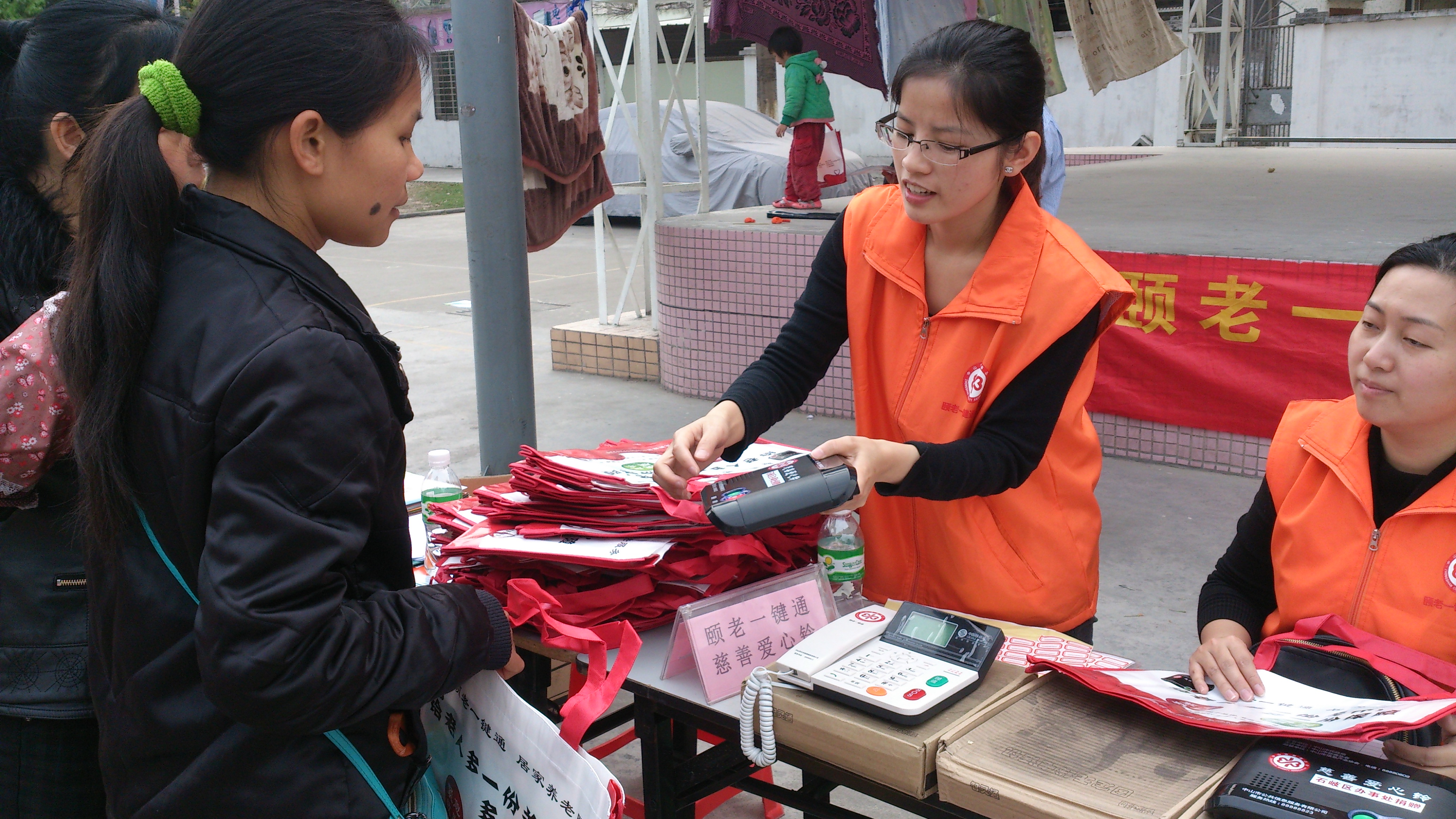 图四 向居民介绍“慈善爱心玲”并赠送环保购物袋