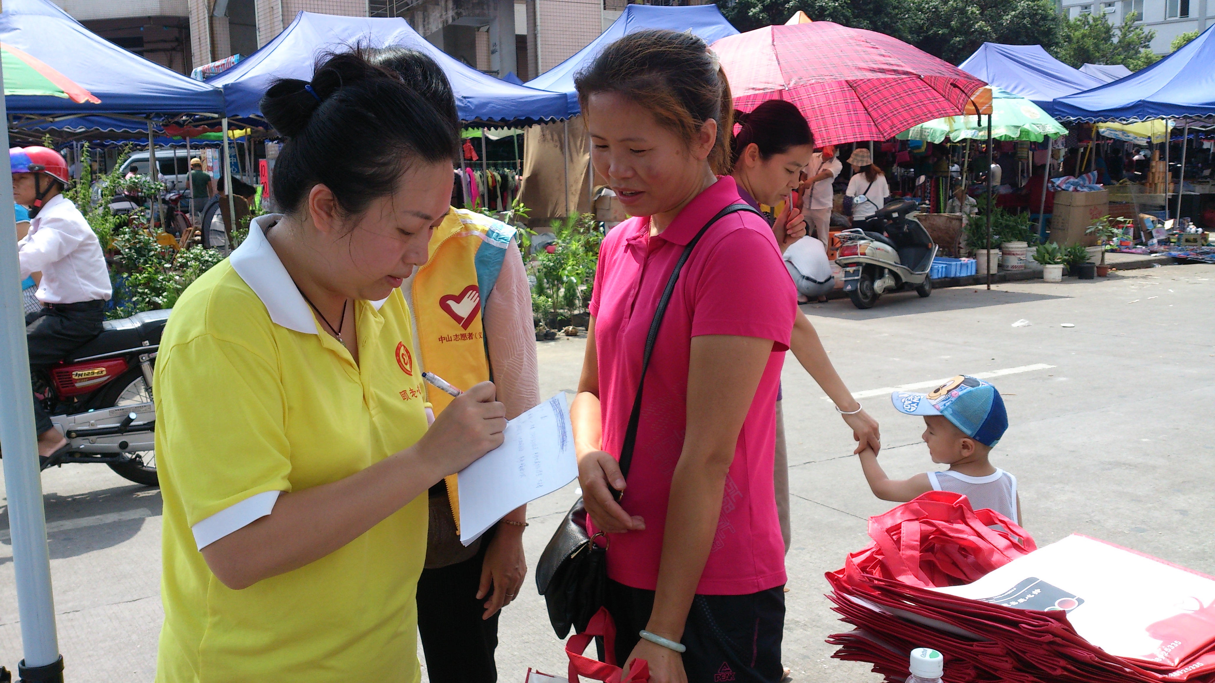 图一 给居民派发“慈善爱心铃”宣传资料和环保袋