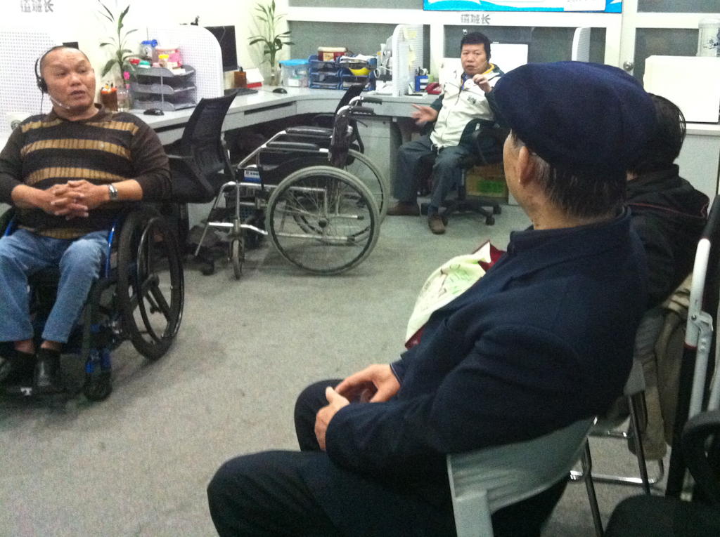 12日中午,刘爷爷和胡婆婆刚吃过午饭便坐上公交车来到颐老一键通客服中心。两位老人的到访,让客服中心的工作人员倍感温暖,立刻招呼老人坐下,并与老人促膝谈心拉家常,现场气氛一片欢乐祥和。在聊天中我们了解到,两位老人原籍甘肃,很多年前便来到中山定居,平时儿女工作繁忙。2012年,刘爷爷和胡婆婆申请安装了慈善爱心铃设备,此后定期接到客服中心的电话回访及问候,对客服中心工作人员的服务非常赞赏。刘爷爷说:“平时在电话里听到你们的声音温和有礼,言语中带着浓浓的关心,而且非常有耐性,就好像自家的孩子一样,非常窝心。每次接到你们打来的电话,我们俩都很高兴。”刘爷爷还表示,他们一直享受着爱心铃真挚的服务,心里一直很是感激,而且也很好奇电话那头到底是怎样的一班年轻人,于是便亲自过来一探究竟。胡婆婆说:“老伴一直说想要来看看你们,想当面感谢你们为我们老人做的贡献。”让两位老人感到意外的是,在客服中心的工作人员里,有一部分还是行动不便的残疾人。老人赞扬这些身残志坚的工作人员能够用自己的力量去服务社会、服务老人,工作既真诚又细心,让老人切切实实地感受到一份关怀和温暖。