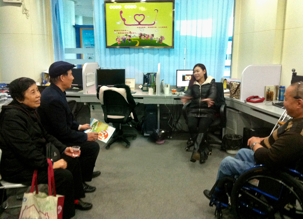 颐老一键通客服中心的工作人员热情邀请刘爷爷(右二)和胡婆婆(左二)