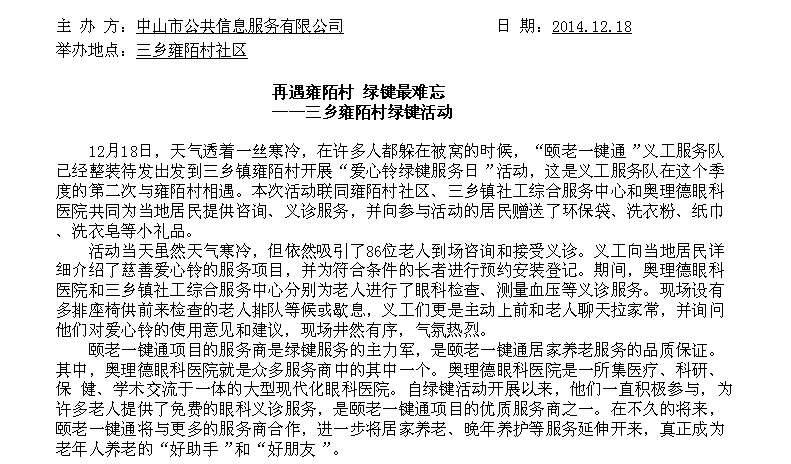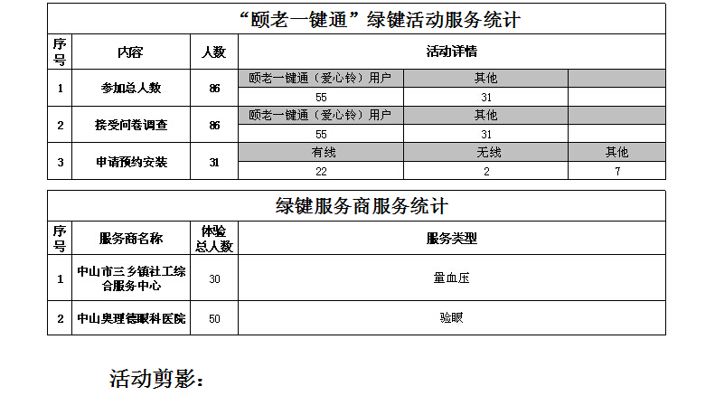 三乡雍陌村社区 绿键活动情况统计