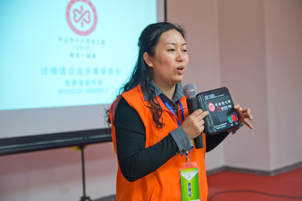 图为颐老一键通讲座现场,主讲义工详细介绍了颐老一键通项目的三大养老服务模块。