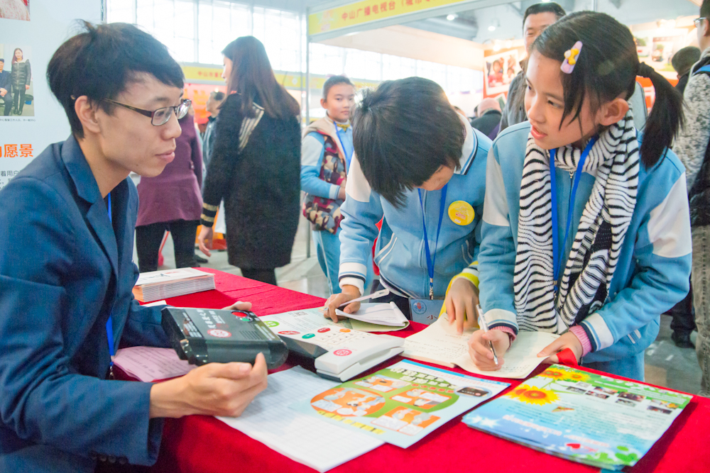 校园小记者们也来到颐老一键通展位进行采访,敬老意识要从娃娃抓起。
