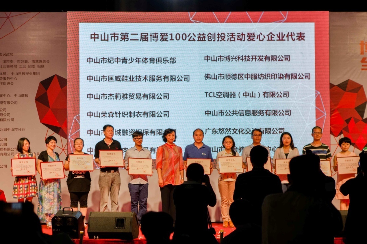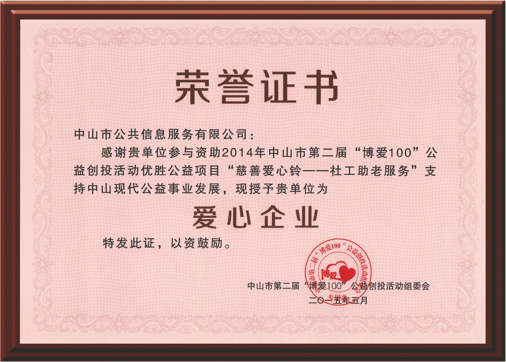 启动仪式上,中山市公共信息服务有限公司因参与资助中山市第二届“博爱100”工艺创投活动优胜公益项目“慈善爱心铃——社工助老服务”支持中山现代公益事业发展,被授予 “爱心企业”的光荣称号。本届“博爱100”公益创投活动,在多个方面进行了优化,相比前两届具有多个特色亮点。今年组委会总投入约560万元专项资金,近460万元作为种子资金直接赞助入选公益项目,增加了创投活动版块,扩大活动影响力,由主版块公益创投、镇区版块公益创投、逸仙杯中山海外青年公益创新大赛、社区公益创投大赛和职工服务创投大赛等5个部分组成,预计近300个公益项目和公益创意点子获得资金资助。