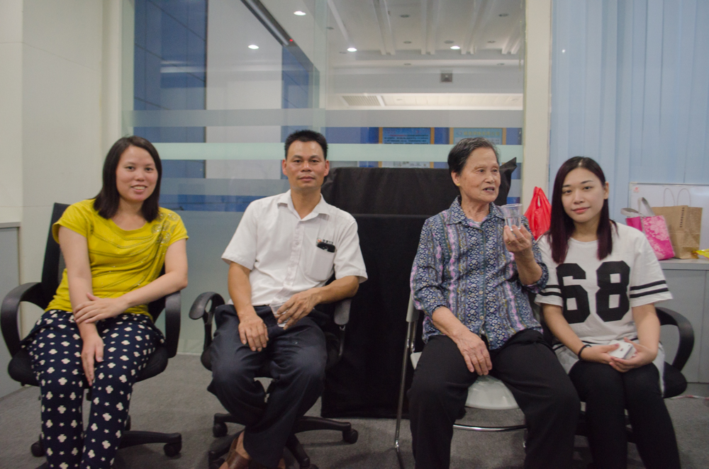 中午11点多,徐婆婆吃过饭后,独自一人拿着四五斤荔枝与粽子便出门了。由于不知道颐老一键通服务中心在哪里,婆婆拿着一张写有中心地址与电话的小纸条,在邻居李叔的帮助下,乘坐摩托车来到客服中心。看见婆婆一个人拿着重物来探望,在场所有工作人员都特别感动。徐婆婆表示,之前一直都有头晕、头痛症状,在患病期间,收到了爱心铃客户人员的真诚关怀,让她倍感温暖,“一直很感谢您们能够常常打电话给我,不仅关心我的衣食住行,还关心我的生活和心情,您们给我的感觉就像是另一位家人,很窝心。最近身体好些了,我就想过来看看你们!”