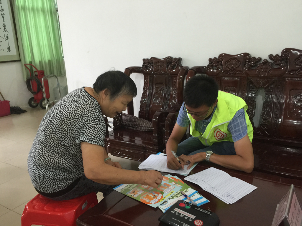 义工为有意愿安装爱心铃的老人进行信息登记。