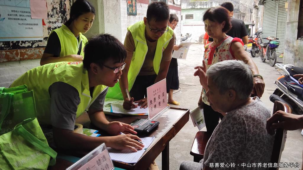 义工向未安装爱心铃的老人讲解爱心铃的功能和使用方法,并为老人进行装信息。