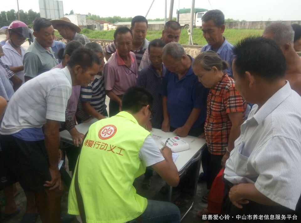 9月10日,“东区博爱行动分队爱心铃小队”来到坦洲镇新合村开展“爱心铃绿键服务日”活动。当日,小队分别在灯笼路口与大冲口公园为村民服务,通过派发宣传单张及义工的耐心讲解,向村民介绍爱心铃的功能、使用方法和服务项目等,同时为符合安装条件的老人进行信息登记,并随即派出义工上门为老人安装爱心铃终端设备,让老人真切地感受到爱心铃高效、便捷的养老服务。