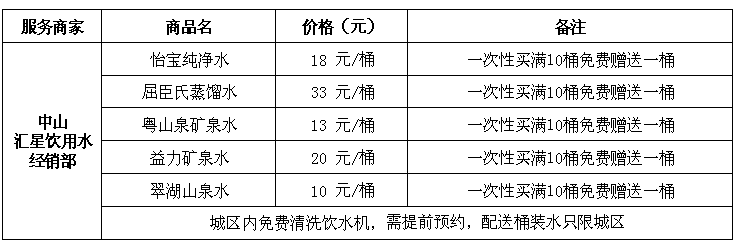 生活百事服务商家:中山汇星饮用水经销部、中山市沙溪镇日昇饮用水商行