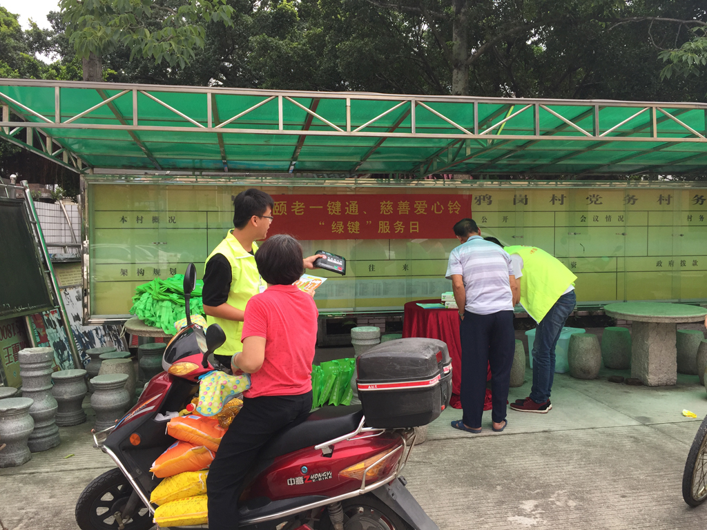 数十位村民来到现场,向义工队咨询爱心铃服务,其中接近一半村民都选择了登记安装,场面热烈。51岁的陈阿姨是本地人,刚刚下班的她被现场的氛围吸引住,于是过来咨询。“我爸今年快80了,身体一直很不好,家里经常没人照顾他,我打算装一个爱心铃,以后有什么事也有义工知道!”